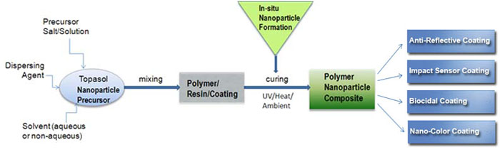 The innovation of Topasol's INSITU NP technology is a method of forming nanoparticles in-situ of the polymer/resin matrix in one step. Topasol has demonstrated nanoparticles formation in coatings in trace amounts (<0.2%) for sensor applications to as high as 10% for other applications. The proposed process appeals to manufacturers due to reduced cost, improvement in nanoparticle purity, and reduced health risks to nanopowder exposure. The topasol additives provide higher particle content with significantly reduced viscosity compared to other particle options.